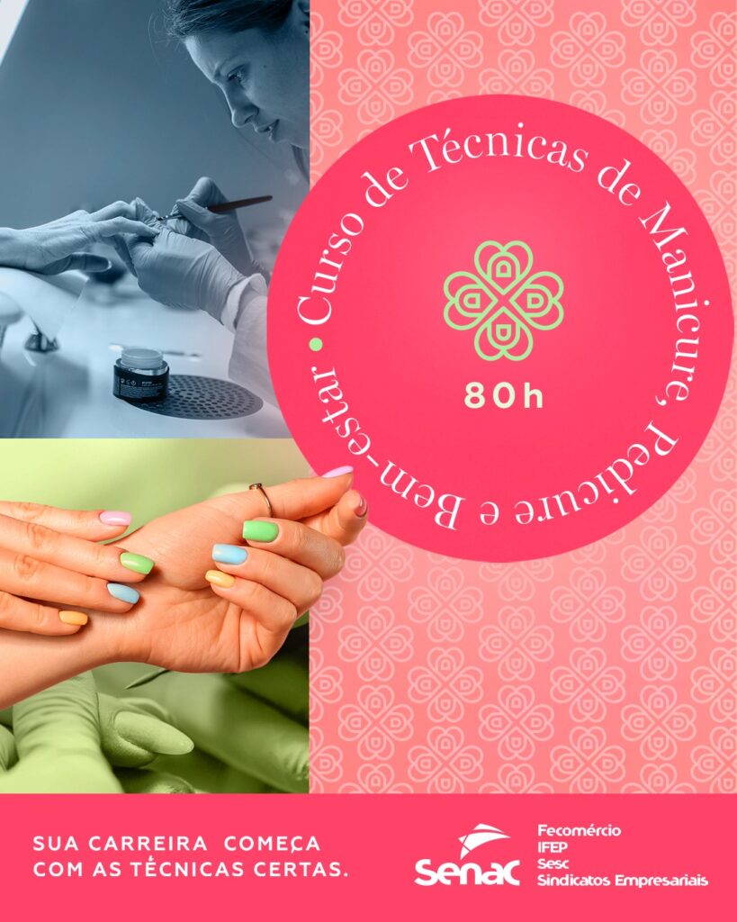 O curso de Técnicas de Manicure e Pedicure (80h) vai te ensinar desde a biossegurança até as técnicas de esmaltação e spa dos pés e mãos.